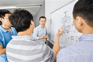 在位于深圳科学馆的深圳云天励飞技术有限公司,创始人陈宁(左三)与员工交流(2016年5月18日摄)。新华社发
