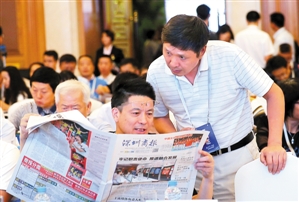 参加论坛的嘉宾阅读《深圳商报》。 深圳商报记者 施平摄