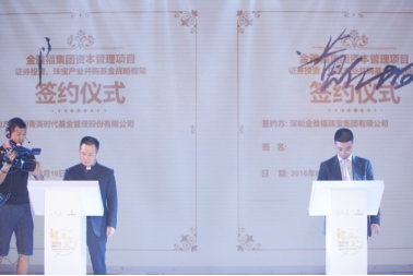 (深圳菁英时代基金管理股份有限公司董事长陈宏超与金雅福集团董事长黄仕坤代表双方上台签约)