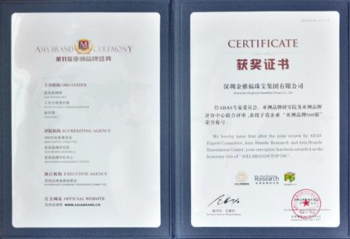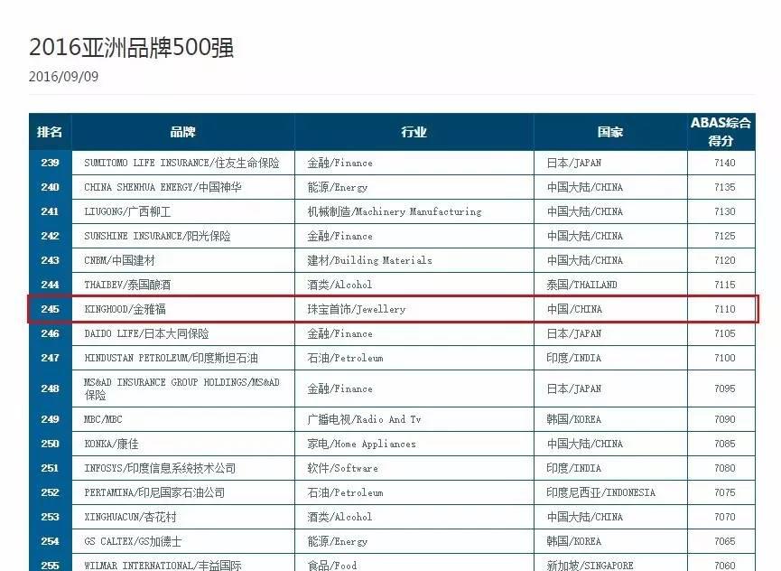 金雅福集团七度蝉联“亚洲品牌500强”,排名上升至第245名